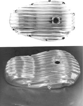 This is a beautiful webco-type cast aluminum finned primary cover. It is not polished, rough, just as it was cast. The finish is left for the owner. It can be polished to a high shine polish, or it can be painted. The cover fits 650cc unit triumphs, 1963-1973. It has two holes; one for the inspection, the other to adjust without removing the cover. No hardware is included. The maching is done by hand. The one picture shows the polished cover on motorcycle (happy owner in norway).